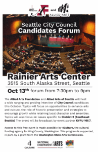 The Allied Arts Foundation and Allied Arts of Seattle will host a wide ranging and probing interview of City Council candidates this October 13th. Topics will focus on opportunities to enhance arts and culture, the role of historic preservation and strategies to encourage growth while retaining local character and amenities. Topics will also focus on issues specific to District 2 (Southeast Seattle).